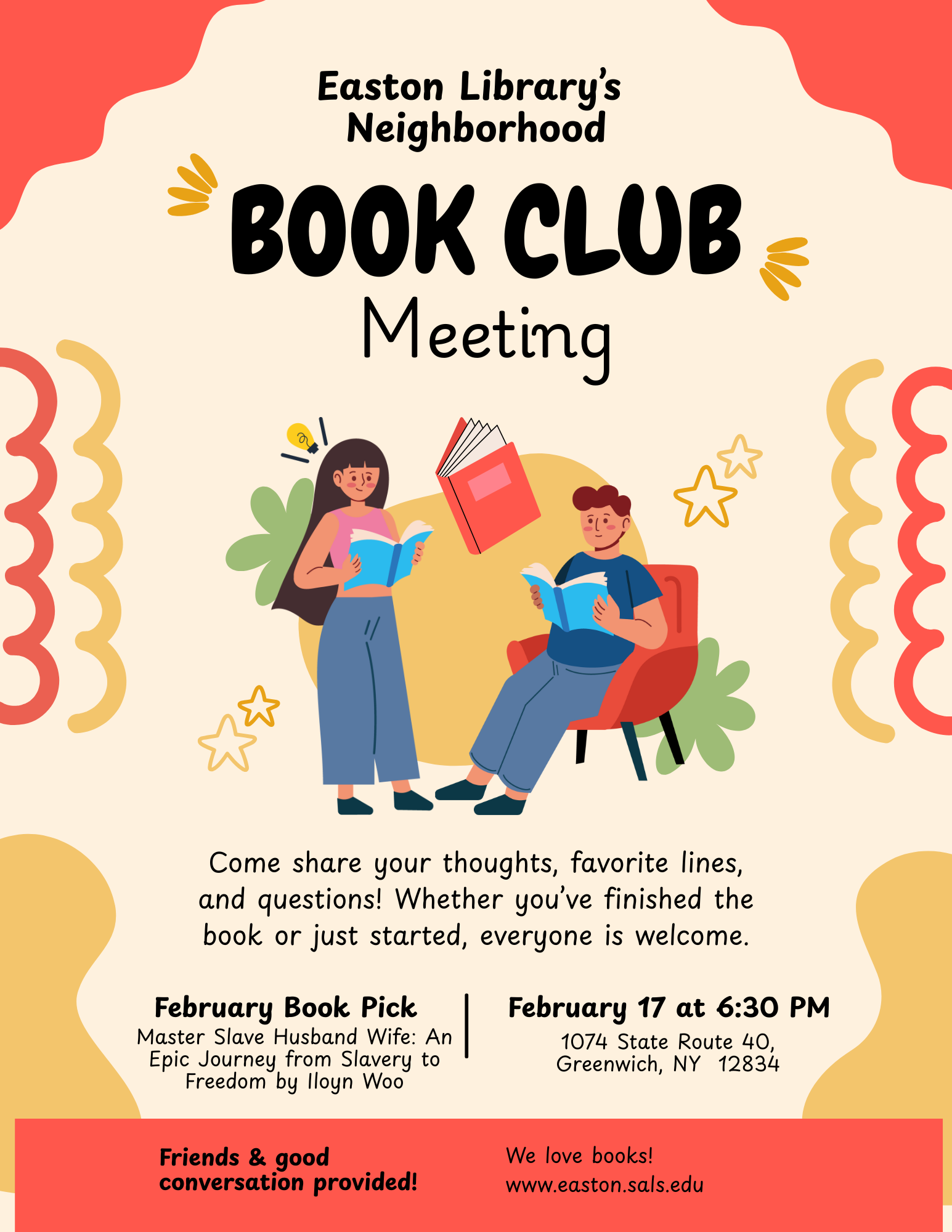 Comments Off on The Neighborhood Book Club will meet on Tuesday, February 17, at 6:30 p.m. to discuss the book pick, “Master Slave Husband Wife” by Ilyon Woo.