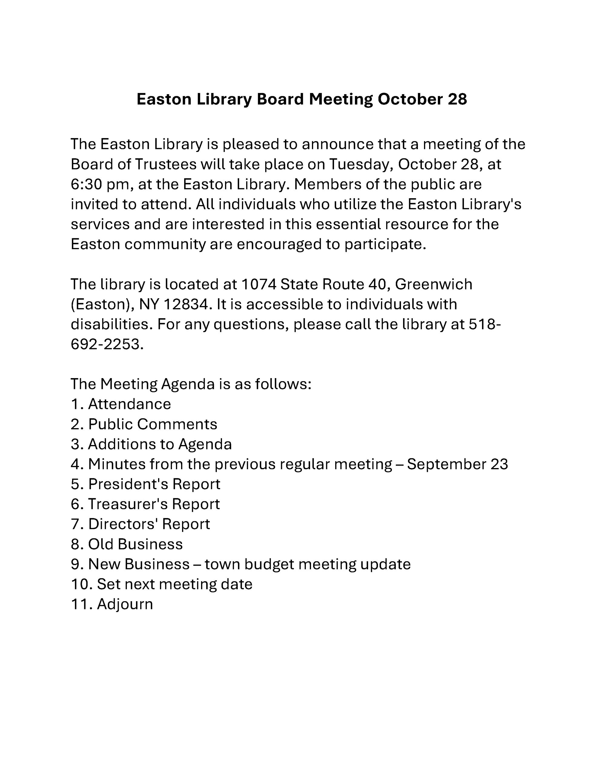 Comments Off on The Great Give Back begins October 12. The Easton Library & Greenwich Free Library will be collecting paper products to support The Comfort Food Community. Please see the flyer or call the library at 518-692-2253 for a list of requested items.