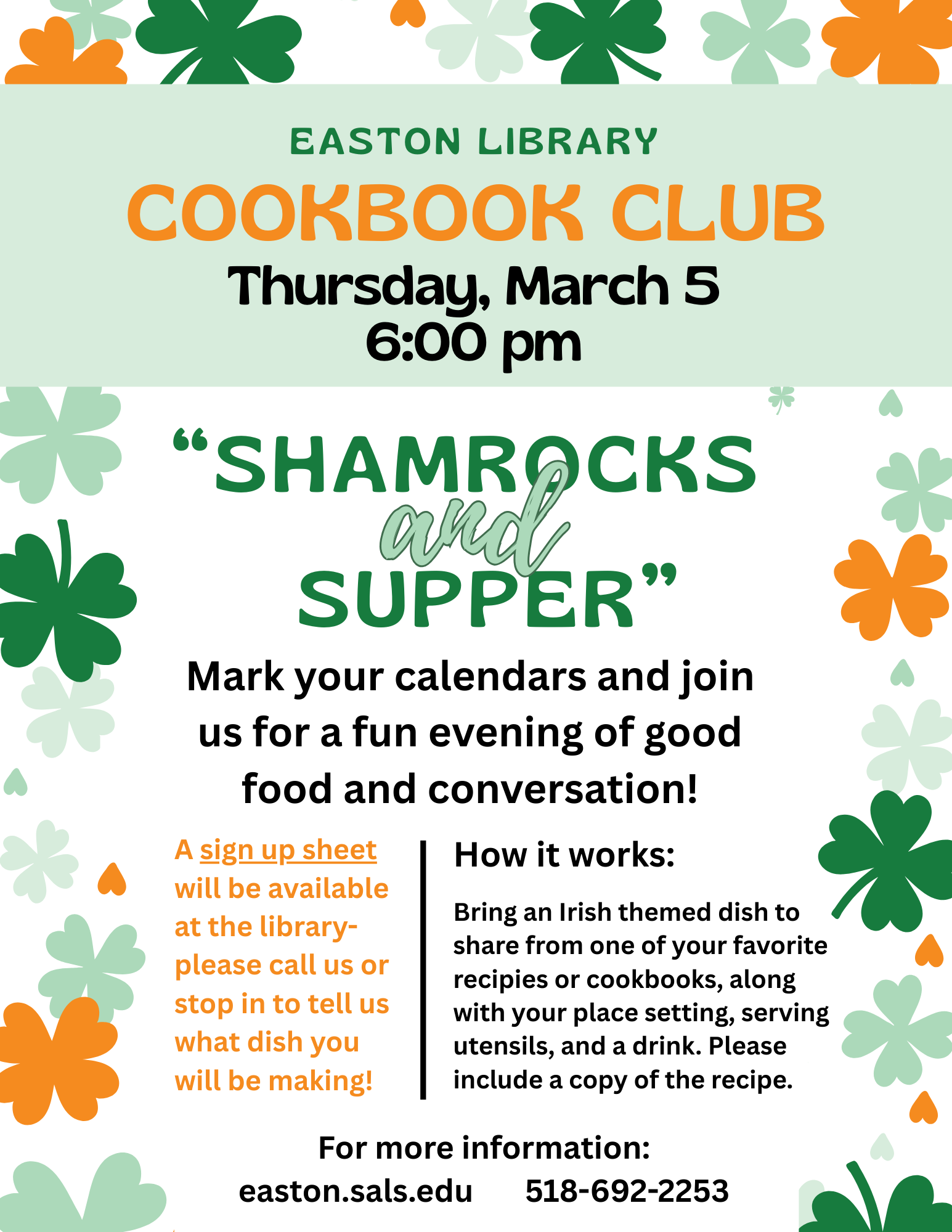 Comments Off on The Cookbook Club will meet on Thursday, March 5, at 6:00 pm. New members are always welcome! Bring your best Irish-themed dish to share.