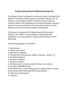 The Easton Library would like to announce that a Board of Trustees meeting will be held on Tuesday, February 24, at 6:30 pm, at the Easton Library. The public is welcome to attend. Everyone who uses the services of the Easton Library and has an interest in this vital resource for the Easton community is encouraged to participate.