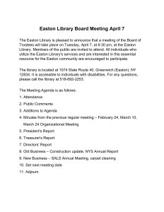 The Easton Library would like to announce that a Board of Trustees meeting will be held on Tuesday, April 7, at 6:30 pm, at the Easton Library. The public is welcome to attend. Everyone who uses the services of the Easton Library and has an interest in this vital resource for the Easton community is encouraged to participate.