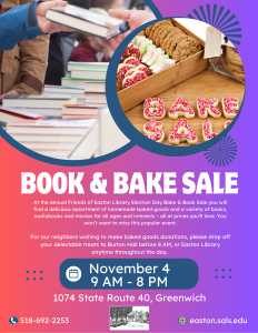 Friends of Easton Library Bake & Book Sale October 28, 2025 by Jennifer DeCarlo Friends of Easton Library Bake & Book Sale 9:00 am – 8:00 pmNovember 4, 2025 Easton Library 1074 State route 40, Greenwich, NY 12834View Location More information iCal Google Calendar View full calendar