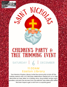 St. Nicholas Day & Tree Trimming Celebration November 19, 2025 by Jennifer DeCarlo St. Nicholas Day & Tree Trimming Celebration 11:00 am December 6, 2025 Easton Library 1074 State route 40, Greenwich, NY 12834View Location More information iCal Google Calendar View full calendar